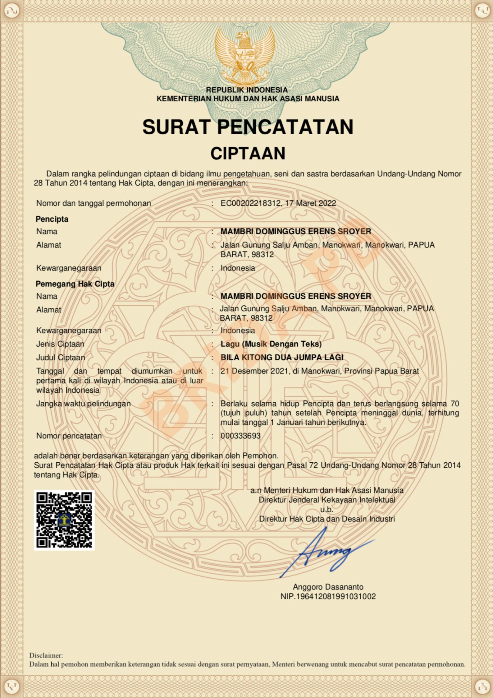 | Pemegang Hak Cipta | : | Mambri Dominggus Erens Sroyer | |